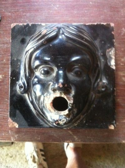 Bouche de fontaine en terre cuite vernissée noire à l’imitation du bronze epoque XVIIIe (ou antérieure). Etat : voir photo. Pas de restauration pas de fêles.