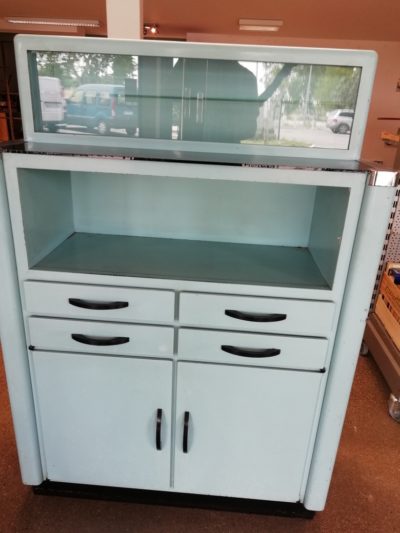 Meuble de dentiste année 50, super état, vitrine avec étagères accès par deux petites portes coulissantes en verre biseauté en dessous étagère libre puis quatre tiroirs fonds en vitre marbrée , deux portes ouvrant sur rangement spacieux avec une étagère métal , superbe opaline noire en tablette avec coins chromé le tout en très bon état